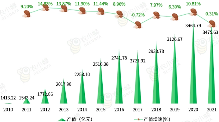 我國食用菌市場總產(chǎn)值隨著食用菌產(chǎn)量的提升也整體呈正增長態(tài)勢,僅2017年小幅下滑。據(jù)中國食用菌協(xié)會統(tǒng)計調(diào)查數(shù)據(jù)顯示,2010~2021年,全國食用菌總產(chǎn)值由1413.22億元增長至2021年的3475.63億元,近11年間增量約2062.41億元、增幅約145.17%、年均復合增長率約9.38%——整體增速明顯高于產(chǎn)量增速。