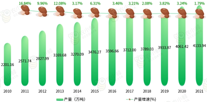 隨著科學技術(shù)研究的不斷深入,食用菌栽培技術(shù)不斷進步,同時,由于消費者需求的結(jié)構(gòu)升級,越來越多的食用菌實現(xiàn)了工廠化、商業(yè)化栽培,并進入消費市場,近年來,我國食用菌產(chǎn)量不斷增加。據(jù)中國食用菌協(xié)會統(tǒng)計調(diào)查數(shù)據(jù)顯示,2010~2021年,中國食用菌總產(chǎn)量由2201.16萬噸增長至2021的4133.94萬噸,11年間增量達1932.78萬噸、增幅約87.81%、年均復合增長率約5.89%。