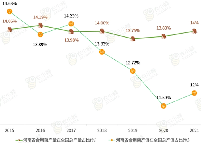 河南具有自然資源、生產(chǎn)成本的優(yōu)勢,在相關(guān)政策和科研創(chuàng)新的推動下,近年來,河南省成為了中國最大的食用菌生產(chǎn)省,隨著全國食用菌產(chǎn)業(yè)格局的發(fā)展與變化,雖然河南省食用菌產(chǎn)量、產(chǎn)值在全國比重均整體呈下降趨勢,但截至2021年,河南省食用菌產(chǎn)量占全國比重仍然在14%左右,產(chǎn)值比重仍然在10%以上。