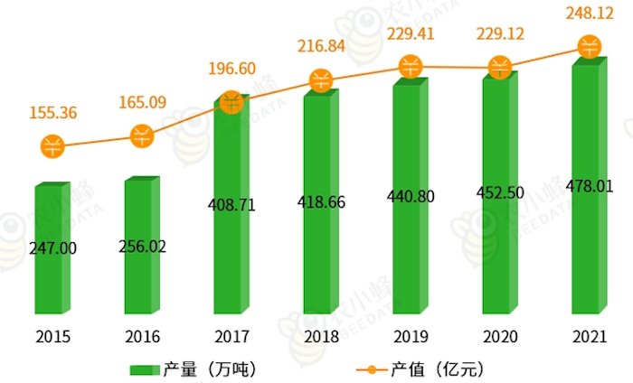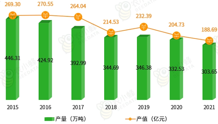 2021年,山東省食用菌產(chǎn)量303.65萬噸,同比減少28.88萬噸,降幅為8.69%,與2015年的446.31萬噸相比,近6年間減少約142.66萬噸,降幅約31.96%;產(chǎn)值188.69億元,同比減少16.04億元,降幅為7.83%,與2015年的269.3億元相比,近6年間減少了80.61億元,降幅為29.93%。長期來看,山東省食用菌年產(chǎn)量維持在300萬噸左右,年產(chǎn)值保持200億元左右發(fā)展。綜合來看,2015年至今,山東省食用菌年產(chǎn)量和產(chǎn)值整體呈下降趨勢,僅2019年出現(xiàn)過小幅的回升。
