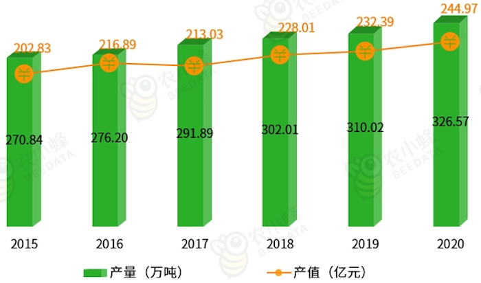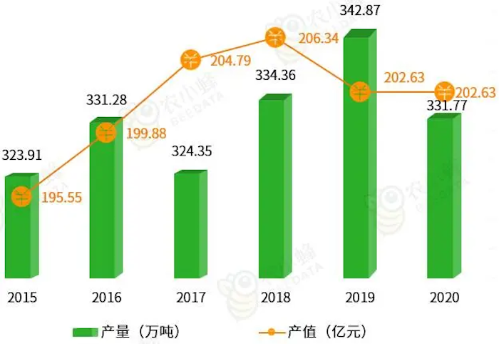 2020年黑龍江省食用菌栽培規(guī)模63萬畝,其中黑木耳栽培規(guī)模和產(chǎn)量居全國首位。2020年,黑龍江省食用菌產(chǎn)量331.77萬噸,同比減少11.1萬噸,降幅為3.23%,與2015年的323.91萬噸相比,近6年間增加約7.86萬噸,增幅約2.4%;產(chǎn)值202.62億元,與2019年持平,與2015年的195.55億元相比,近6年間增加了7.01億元,增幅為3.61%。