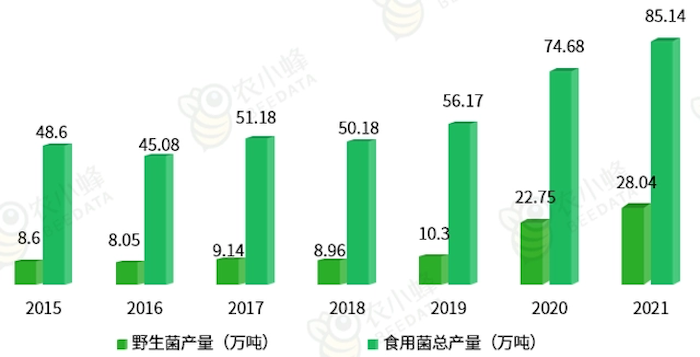 據(jù)云南省省食用菌產(chǎn)業(yè)發(fā)展辦公室統(tǒng)計,2021年,全省食用菌總產(chǎn)量85.14萬噸,總產(chǎn)值324.93億元,云南食用菌總產(chǎn)值全國排名第二位,其中野生食用菌產(chǎn)量28.04萬噸,產(chǎn)值211.13億元;栽培食用菌產(chǎn)量57.1萬噸,農(nóng)業(yè)產(chǎn)值113.8億元。