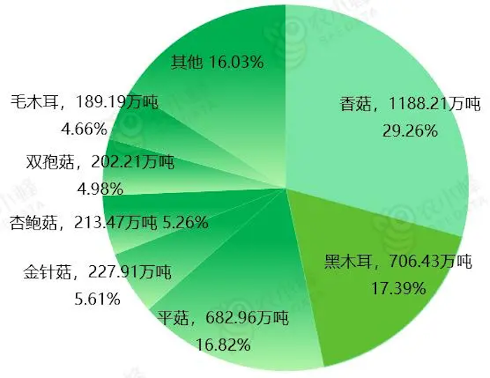 我國食用菌栽培種類有70~80種,其中形成商品種的有50種,具有一定生產(chǎn)規(guī)模的有近30種。我國食用菌雖品類眾多,但常年以香菇、黑木耳、平菇、雙孢蘑菇、金針菇、杏鮑菇和毛木耳為主。