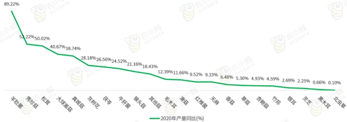 2020年全國大面積和植的食用菌品種中,產(chǎn)量同比增長的有22個品種,分別為:羊肚菌、秀珍菇、松茸、大球蓋菇、真姬菇、灰樹花、獲苓、牛肝菌、猴頭菇、其他菇、毛木耳、滑菇、紅椎菌、天麻、香菇、草菇、杏鮑菇、竹蓀、銀耳、靈芝、黑木耳、北蟲草。