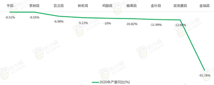 2020年產(chǎn)量減少的有9個品種,分別為:平菇、茶樹菇、白靈菇、姬松茸、雞腿菇、榆黃菇、金針菇、雙抱蘑菇、金福菇。