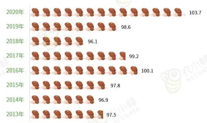2020年全國居民人均蔬菜及食用菌消費量103.7千克,比上年增加了5.1千克,增幅為5.17%。