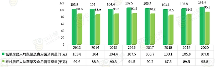 細分消費群體來看,中國城鄉(xiāng)居民人均蔬菜及食用菌消費量還是有一定差距,城鎮(zhèn)居民人均蔬菜及食用菌消費量常年高于農(nóng)村居民。最新數(shù)據(jù)顯示,2020年中國城鎮(zhèn)居民人均蔬菜及食用菌消費量109.8千克,較農(nóng)村居民人均蔬菜及食用菌消費量(95.8千克)高出14千克。