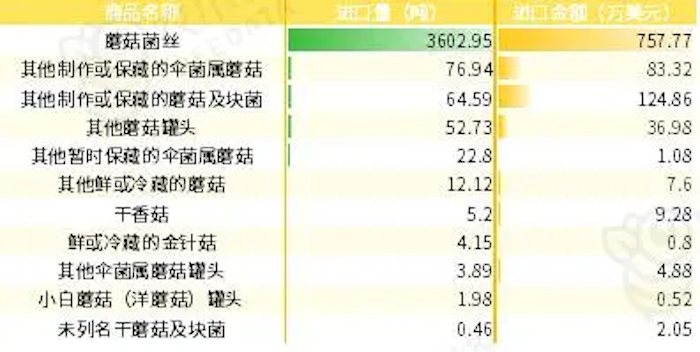 圖表16:2021年中國食用菌相關(guān)進口商品進口量及進口金額對比