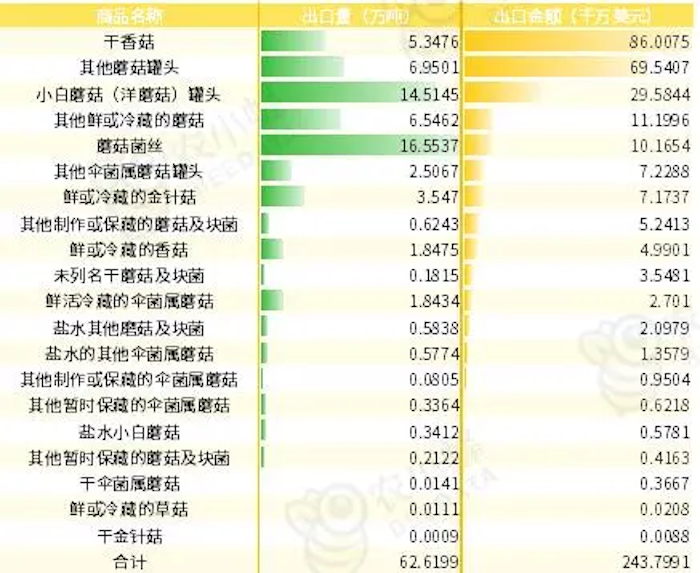3. 從生產(chǎn)品類來看,2020年我國食用菌年產(chǎn)量超100萬噸的種類依次是:香菇(1188.21萬噸)、黑木耳(706.43萬噸)、平菇(682.96萬噸)、金針菇(227.91萬噸)、杏鮑菇(213.47萬噸)、雙孢菇(202.21萬噸)、毛木耳(189.19萬噸)——這7種食用菌2020年產(chǎn)量總和占全國食用菌總產(chǎn)量的83.97%。食用菌上市企業(yè)有眾興菌業(yè)、雪榕生物、華綠生物和萬辰生物。在出口方面,進口量較大的食用菌相關(guān)商品名稱為“蘑菇菌絲”、“其他蘑菇罐頭”、“其他制作或保藏的蘑菇及塊菌”。出口量較大的食用菌相關(guān)商品名稱為“干香菇”、“其他蘑菇罐頭”、“小白蘑菇(洋蘑菇)罐頭”。